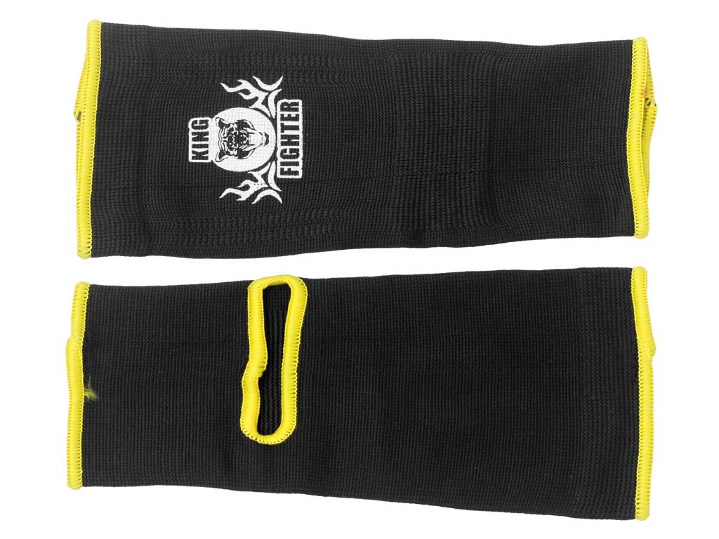 Elastické návleky King Fighter pro ochranu kotníků. Černé chrániče s logem a žlutým ohraničením. Slouží ke zpevnění kotníků a využívají je především thaiboxeři po celém světě. Díky elastickému materiálu skvěle obejmou kotník. Na zadní straně je otvor pro patu. Kvalitní oplet zamezuje párání chráničů.