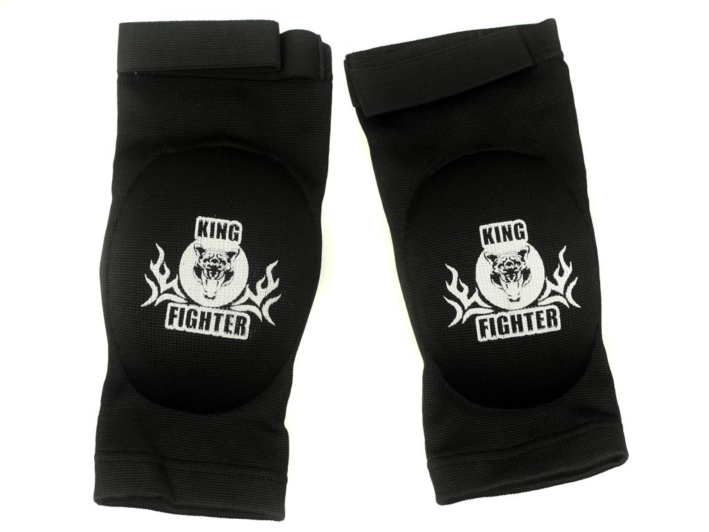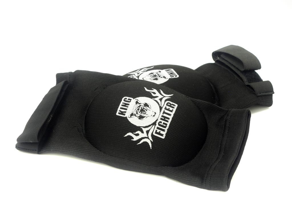 Tyto chrániče loktů King Fighter jsou elastické a drží výborně na ruce. Sklouzávání z ruky zajišťuje horní pásek na suchý zip. Mají zesílenou vrstvu, jsou proto výborné na tvrdý sparring. Chrání loket i obličej sparring partnera. Jsou vyráběné z elastanu a plyesteru. Jsou v černé barvě s bílým logem King Fighter na lokti. Chrániče ocení zejména thaiboxeři - bojovníci Muay Thai - kteří trénují boj v klinči za použití loktů. Tyto chrániče loktů jsou ve větší velikosti XL.