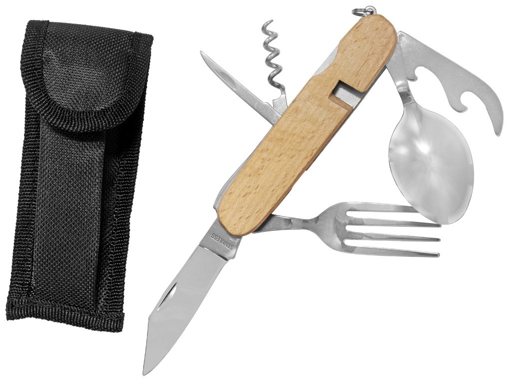 Skládací kempingový příbor Wood, dřevěné střenky, nůž, vidlička, lžíce, otvírák na lahve a konzervy, vývrtka, šídlo, nylonové pouzdro.