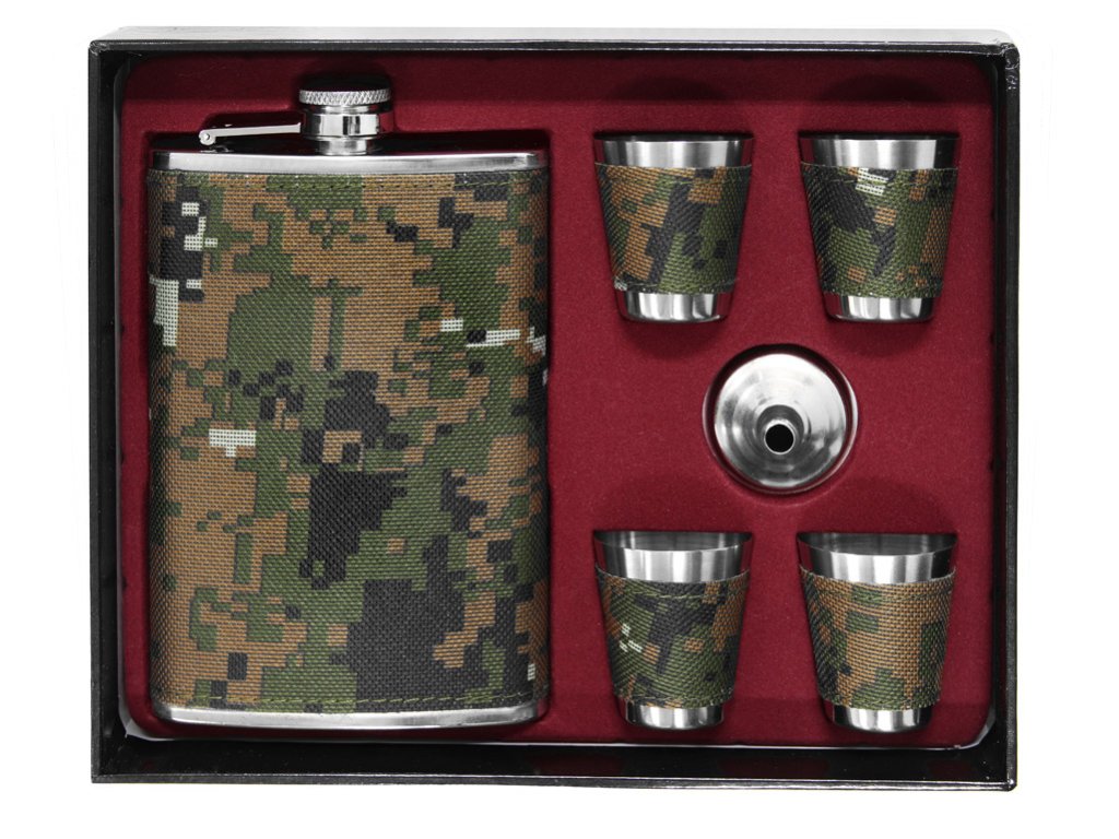 Placatka v dárkovém balení s kalíšky a trychtýřkem, vyrobeno z nerezové oceli, objem 234 ml, barevné provedení digi camo.