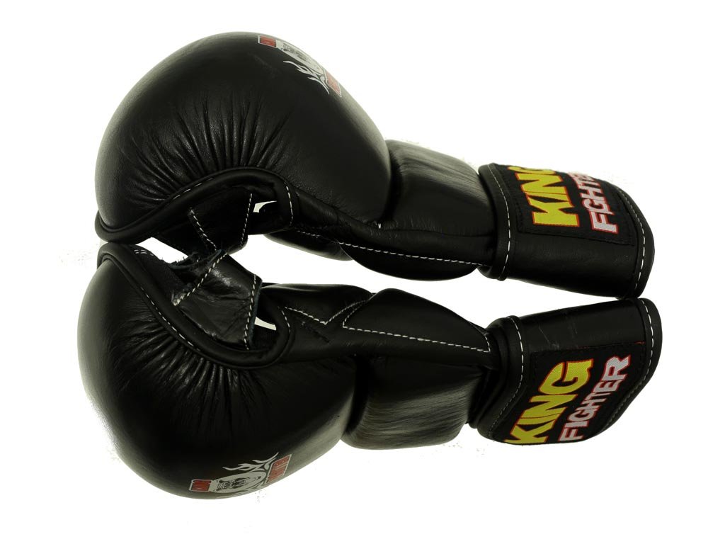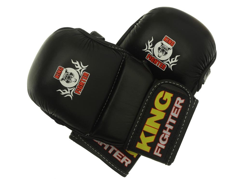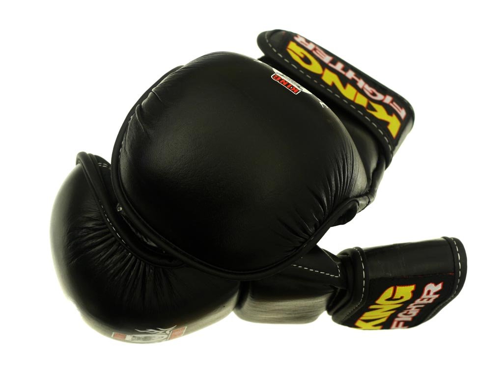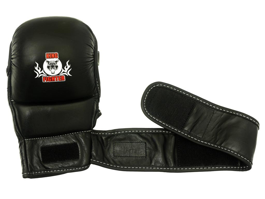 Perfektní bezprsté rukavice pro využití v Krav Maga. Mají silnou tlumící úderovou plochu a chráněný palec. Ostatní prsty jsou volné. Jako stvořené na Krav Maga sparring. V rukavicích lze díky volným prstům provádět techniky otevřenou rukou, držet či blokovat údery. Díky volné dlani lze pohodlně držet tyč či obušek. Můžete tak nacvičovat obranu proti ozvrojenému útočníkovi, aniž byste museli rukavice sundavat. Palec je chráněn výztuží. Při nácviku boxerských technik je palec schovaný a nehrozí jeho zranění. Zápěstí dotáhnete pomocí pásku na suchý zip. Rukavice jsou vyrobeny z kvalitní hovězí kůže s bohatým polstrováním. Na hřbetu tréninkové rukavice je logo King Fighter.