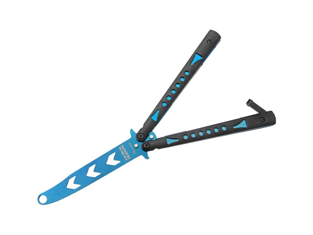 Cvičný motýlek Nůž typu motýlek od firmy Albainox, určený k bezpečnému nácviku triků. Čepel má oblý hrot a tupé ostří. Konstrukčně je řešený stejně jako klasický motýlek. Technické údaje Čepel je vyrobena z nerezové oceli s modrou povrchovou úpravou a třemi designovými otvory. Příložky rukojeti jsou ocelové, střenky hliníkové. Na konci rukojeti je pojistná západka, která drží obě části u sebe.Diskuze