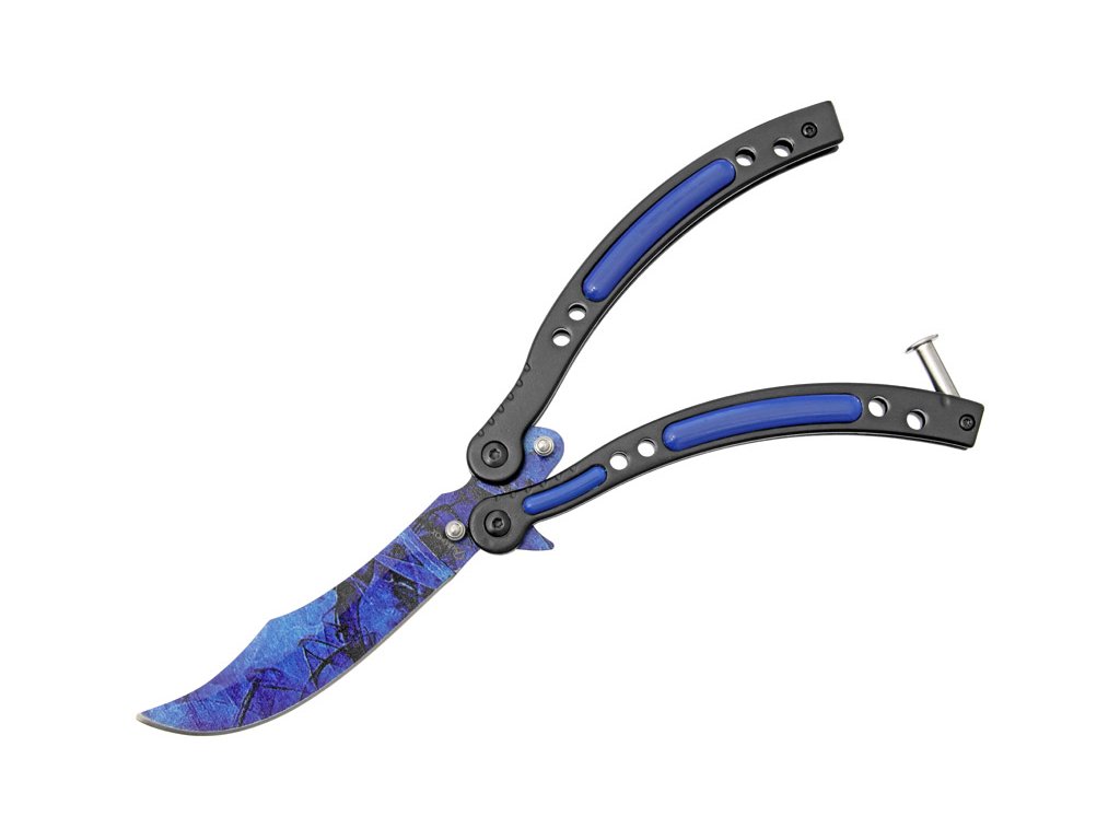 Designový motýlek Designově zajímavý motýlek od firmy Albainox, který zaujme výrazným barevným provedením, prohnutým tvarem a asymetricky uloženou čepelí. Perfektní pro uživatele, kteří mají rádi netradiční vzhled. Technické údaje Čepel je vyrobena z nerezové oceli s barevnou povrchovou úpravou v modrých odstínech. Rukojeť je ocelová s modrými plastovými prvky a na jejím konci je pojistná západka.Diskuze