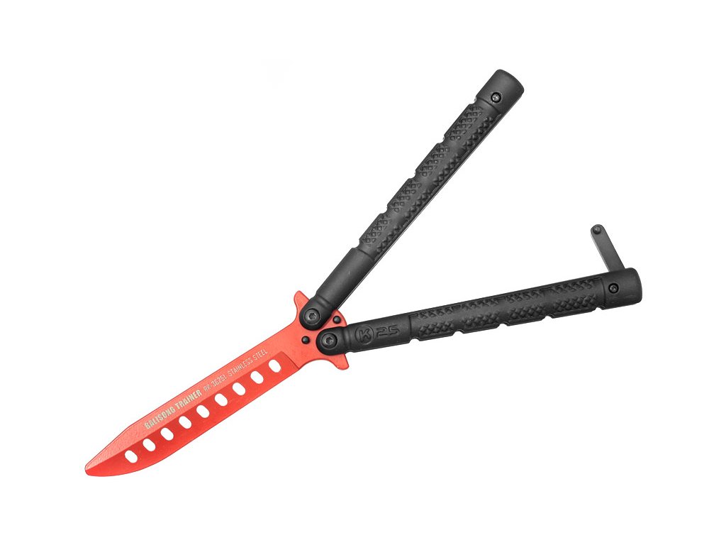 Tréninkový motýlek Nůž typu motýlek od španělské firmy RUI Tactical - K25, určený na bezpečný nácvik triků. Nůž má stejnou konstrukci jako klasické motýlky, ale je opatřen tupou čepelí s oblým hrotem, takže nehrozí žádné riziko poranění. Technické údaje Čepel je vyrobena z nerezové oceli v červené barvě, je tupá a má oblý hrot. Rukojeť má ocelové příložky a na nich jsou hliníkové střenky v černé barvě. Na konci rukojeti je západka, která drží obě části u sebe. Nůž je dodáván s černým nylonovým pouzdrem.Diskuze