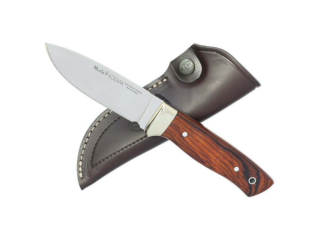 Elegantní integrální nůž Muela Kodiak 10 CO pro lov a pobyt v přírodě s alpakovým kováním, dřevěnými střenkami a koženým pouzdrem.