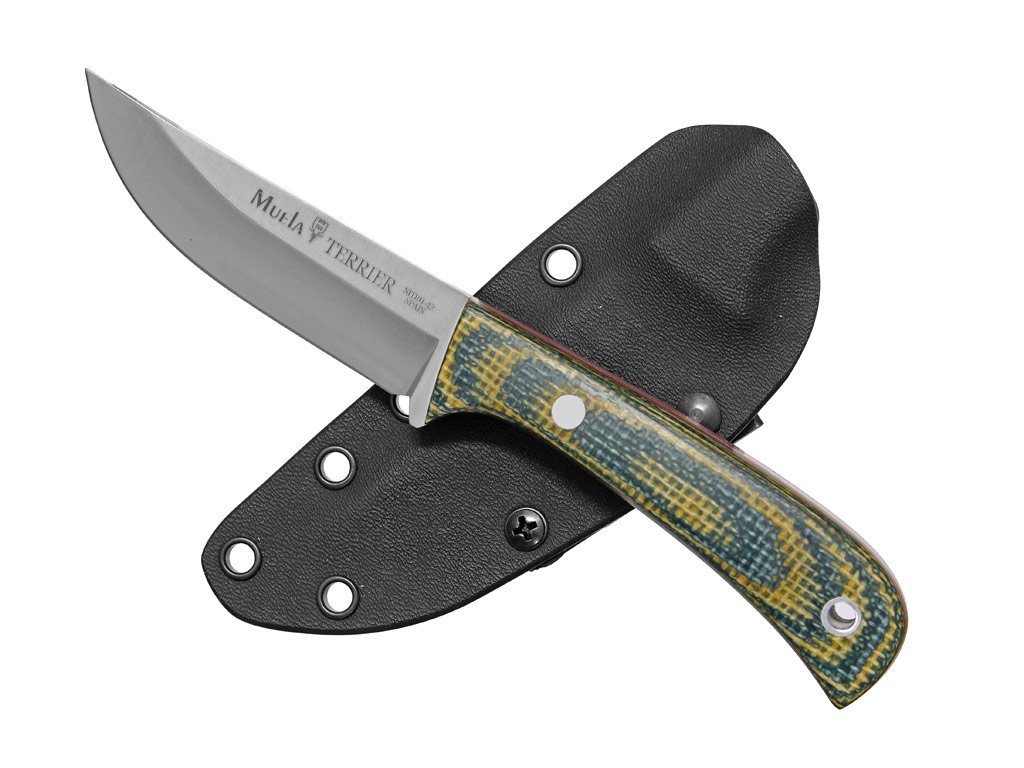 Malý nůž Muela Terrier 9 G/K, integrální konstrukce, střenky z barevné mikarty, otvor na závěsnou šňůru, kydexové pouzdro.