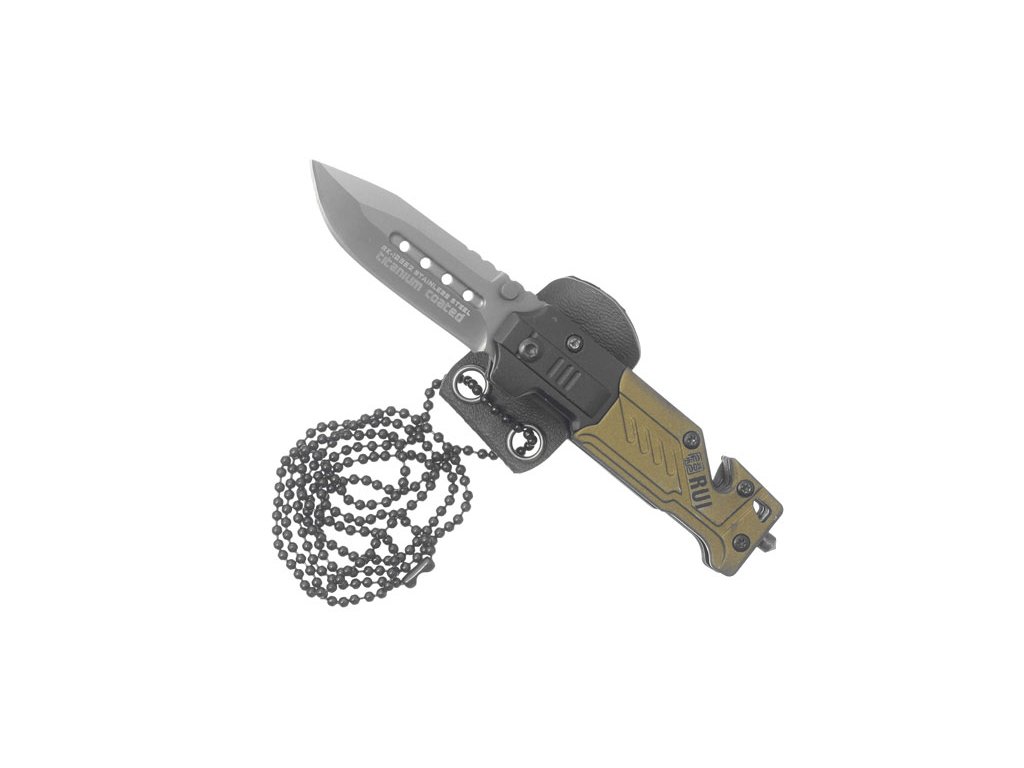 Malý praktický pomocník Zavírací nůž velmi malých rozměrů od firmy RUI Tactical, který můžete mít neustále u sebe a žádná nečekaná situace vás nezaskočí. Nůž je i přes své malé rozměry dobře použitelný a je vybaven záchranářskými prvky - řezačem pásů a hrotem na rozbíjení skla. Technické údaje Čepel je vyrobena z nerezové oceli s šedou povrchovou titanovou úpravou. Na čepeli je kolíček pro snadné otvírání jednou rukou. V otevřeném stavu je čepel fixována pojistkou linerlock. Příložky rukojeti jsou ocelové a na nich hliníkové střenky v khaki barvě a černé kování. Na konci rukojeti je řezač pásů a kovový hrot. Nůž je dodáván s kydexovým pouzdrem pro zavěšení na krk.Diskuze