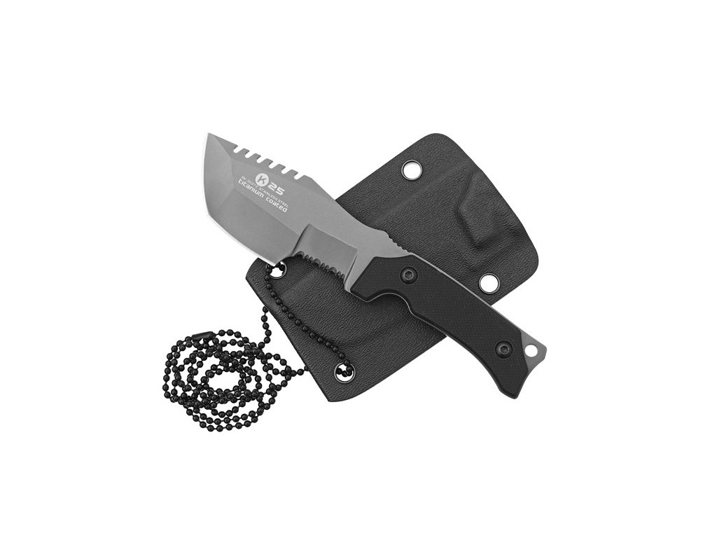 Malý nůž na krk RUI Tactical 32372 K25, kombinované ostří, střenky z G10, integrální konstrukce, titanová povrchová úprava, závěsné kydexové pouzdro s řetízkem.