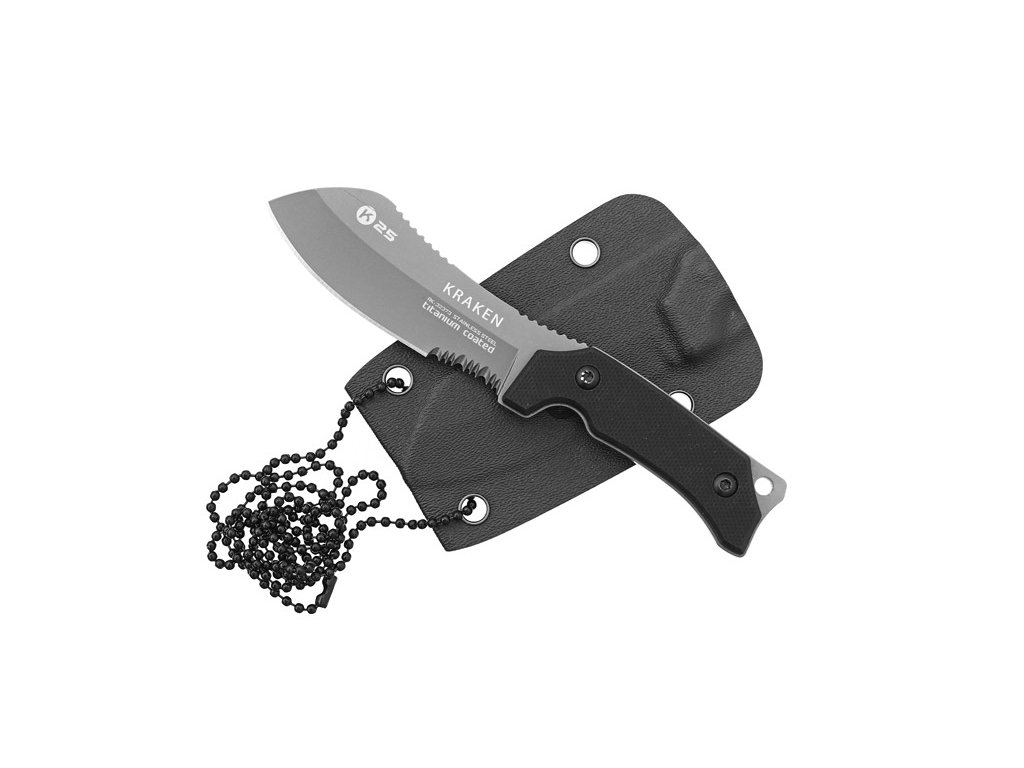 Kraken na krk Malý nůž od firmy RUI Tactical - K25, který je zmenšenou variantou outdoorového nože Kraken od stejné firmy. Je určený k nošení na krku a je standardně použitelný. Ideální pro uživatele, kteří nechtějí nebo nemohou nosit nůž v kapse. Technické údaje Nůž má integrální konstrukci, je vyroben z jednoho kusu nerezové oceli s matně šedou titanovou povrchovou úpravou a má částečně zoubkované ostří. Střenky jsou vyrobeny z odolného materiálu G10 s hrubým protiskluzovým povrchem. Nůž je dodáván s kydexovým pouzdrem a řetízkem.Diskuze