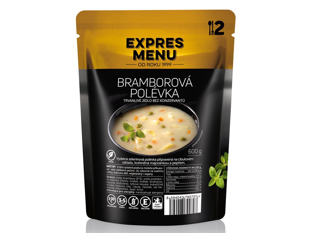 Vydatná polévka, ideální pro outdoor, cestování či jako domácí zásoba pro nečekané situace, velmi dlouhá trvanlivost i při pokojové teplotě, snadný ohřev, bez lepku, éček a chemie, český výrobek.