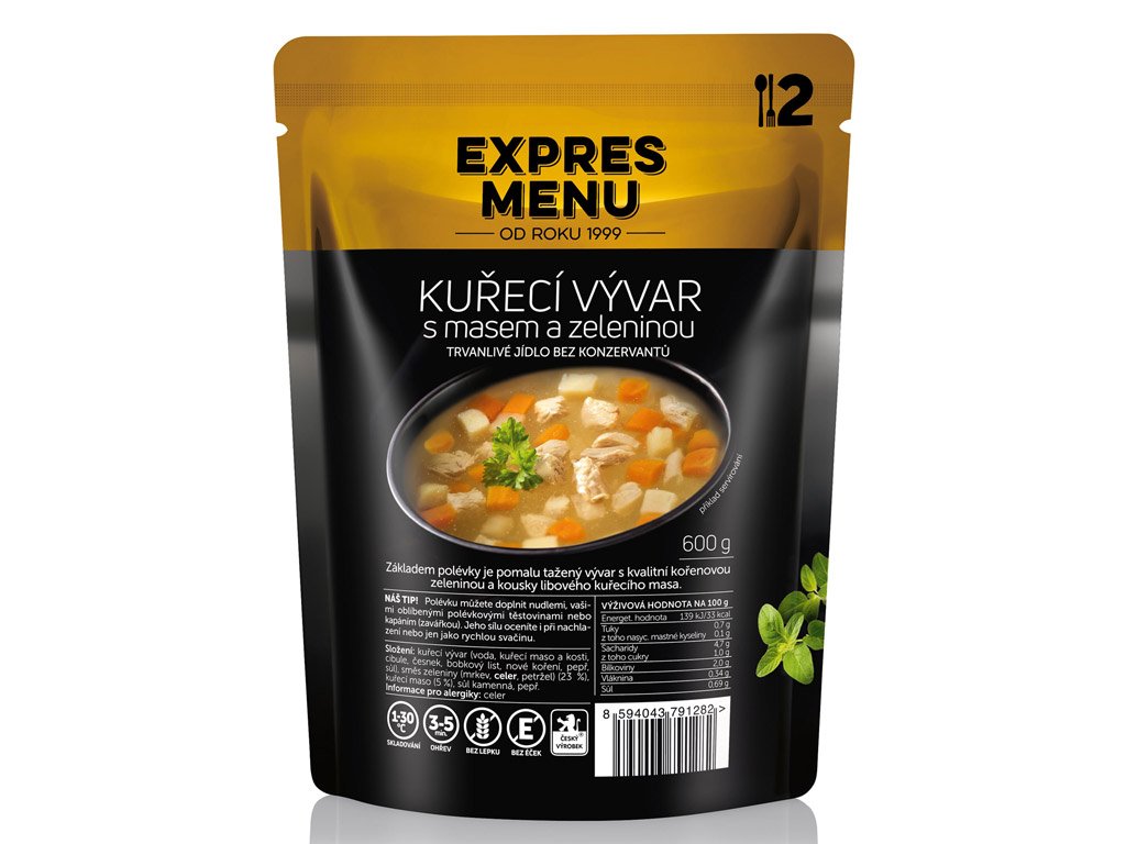 Základem polévky je pomalu tažený vývar s kvalitní kořenovou zeleninou a kousky libového kuřecího masa. Poctivé, plnohodnotné jídlo vařené od základu z kvalitních surovin a bez chemie. Trvanlivost až 10 let. Složení kuřecí vývar (voda, kuřecí maso a kosti, cibule, česnek, bobkový list, nové koření, pepř, sůl), směs zeleniny (mrkev, celer, petržel) (23 %), kuřecí maso (5 %), sůl kamenná, pepř Nutriční hodnoty na 100 g Energetická hodnota kJ: _119 Energetická hodnota kcal: _28 Tuky: _1,1 g Nasycené mastné kyseliny: _0,0 g Sacharidy: _1,5 g z toho cukry: _0,0 g Bílkoviny: _3,4 g Vláknina: _0,6 g Sůl: _0,7 gDiskuze