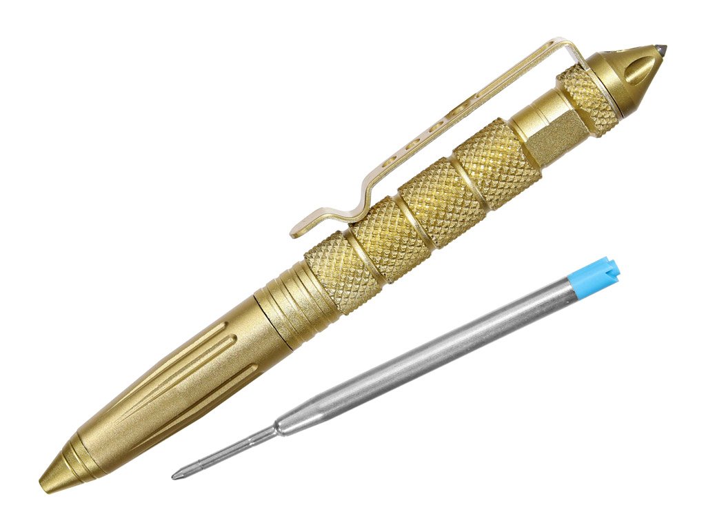 Taktické pero HT-4705-GOLD, zlatá brva, propiska a nenápadný sebeobranný prostředek v jednom, karbidový hrot na rozbíjení skla, kapesní klips, náhradní náplň.