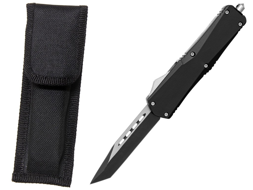 Vystřelovací nůž Black Tactical Tanto, vysouvání a zasouvání čepele ovládané jedním posuvným tlačítkem, hliníková rukojeť s protiskluzovou úpravou, kapesní klisp, úderový hrot, pouzdro.