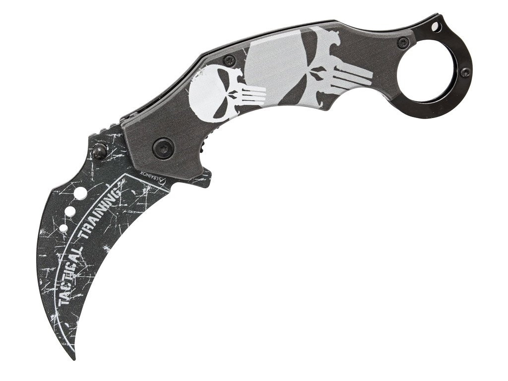 Tréninkový karambit Zavírací nůž typu karambit, určený na bezpečný nácvik bojových technik s tímto specifickým druhem nože. Má tupou čepel s oblým hrotem, jinak je konstrukčně shodný s ostrými noži. Navíc je opatřen vnitřní pružinou asistovaného otevírání, takže otevření je otázkou zlomku vteřiny. Technické údaje Čepel je vyrobena z nerezové oceli 3Cr13MoV a je opatřena oboustranným kolíčkem i flipperem pro snadné otevírání jednou rukou. Příložky rukojeti jsou ocelové, střenky jsou z plastu s potiskem lebky. Na pravé straně rukojeti je kapesní klips.Diskuze