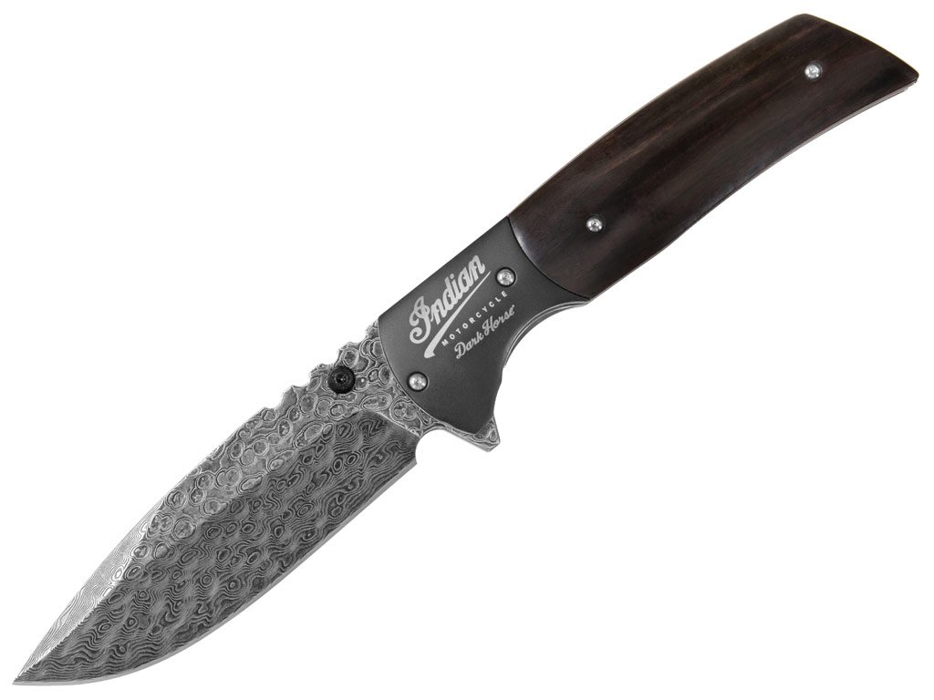 Mohutný stylový zavírák Indian Motorcycle Mohutný zavírací nůž ze série Indian Motorcycle, která vzdává hold těmto legendárním motorkám, přičemž tento model je věnován konkrétně řadě Dark Horse. Jedná se o nůž do chlapské ruky, který je nejen dokonalým nástrojem, ale současně i stylovým doplňkem motorkářské výbavy. Prostě pořádný nůž, se kterým uděláte pořádný kus práce. Technické údaje Čepel je vyrobena z damaškové oceli s krásnou jemnou strukturou a tmavou povrchovou úpravou. Pro snadné otevírání jednou rukou je nůž opatřen oboustranným kolíčkem na čepeli a flipperem. Čepel je uložena na kuličkovém ložisku pro hladký chod. V otevřené poloze je čepel fixována pojistkou linerlock. Kování je ocelové s černou povrchovou úpravou, příložky rukojeti jsou ocelové a střenky jsou z ebenového dřeva.Buďte první, kdo napíše příspěvek k této položce.