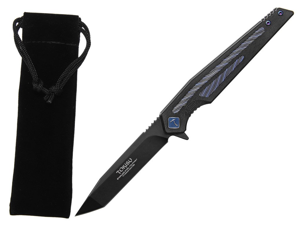 Štíhlý zavírací nůž Tokisu 18877, jednoruční otevírání, černá povrchová úprava čepele, střenky z G10 s elegantní modrou výložkou, pojistka linerlock, kapesní klips.